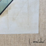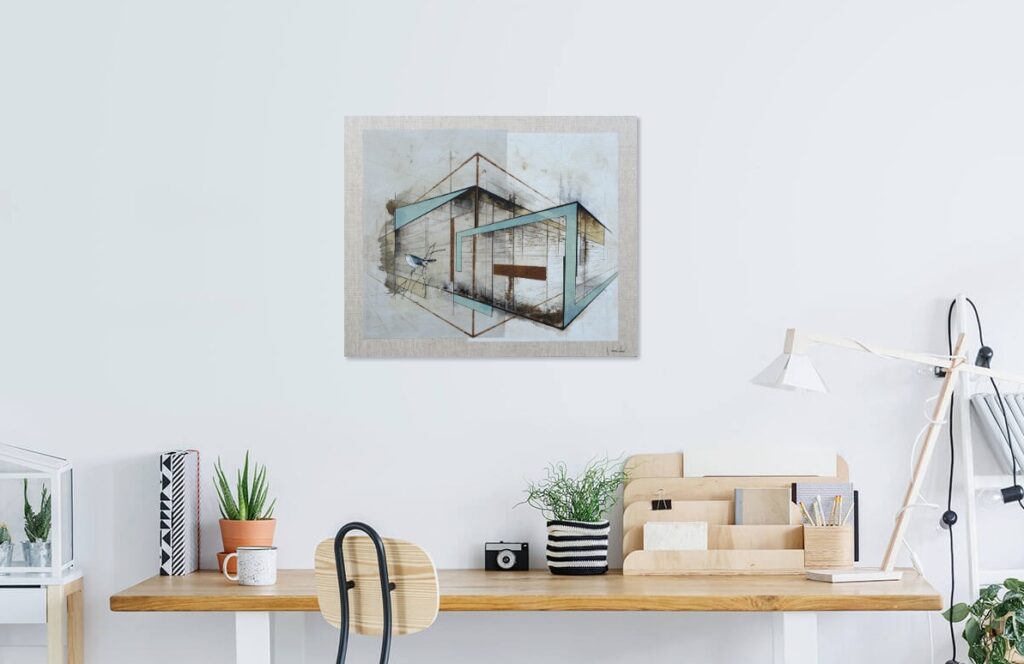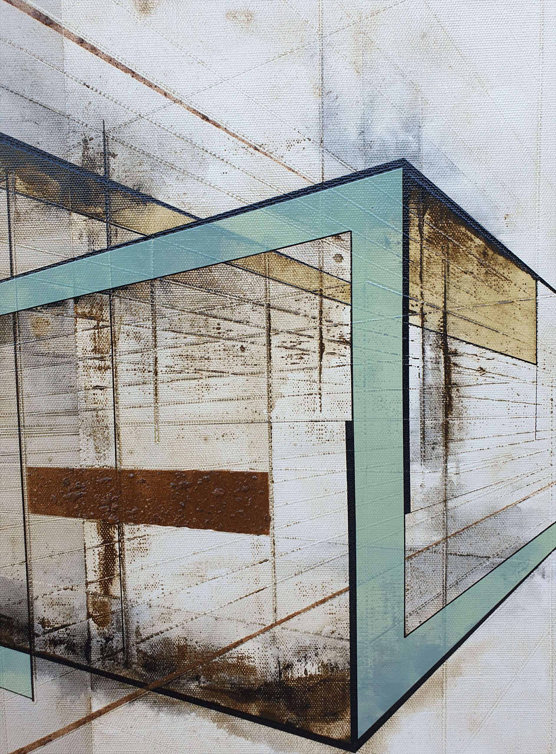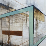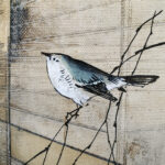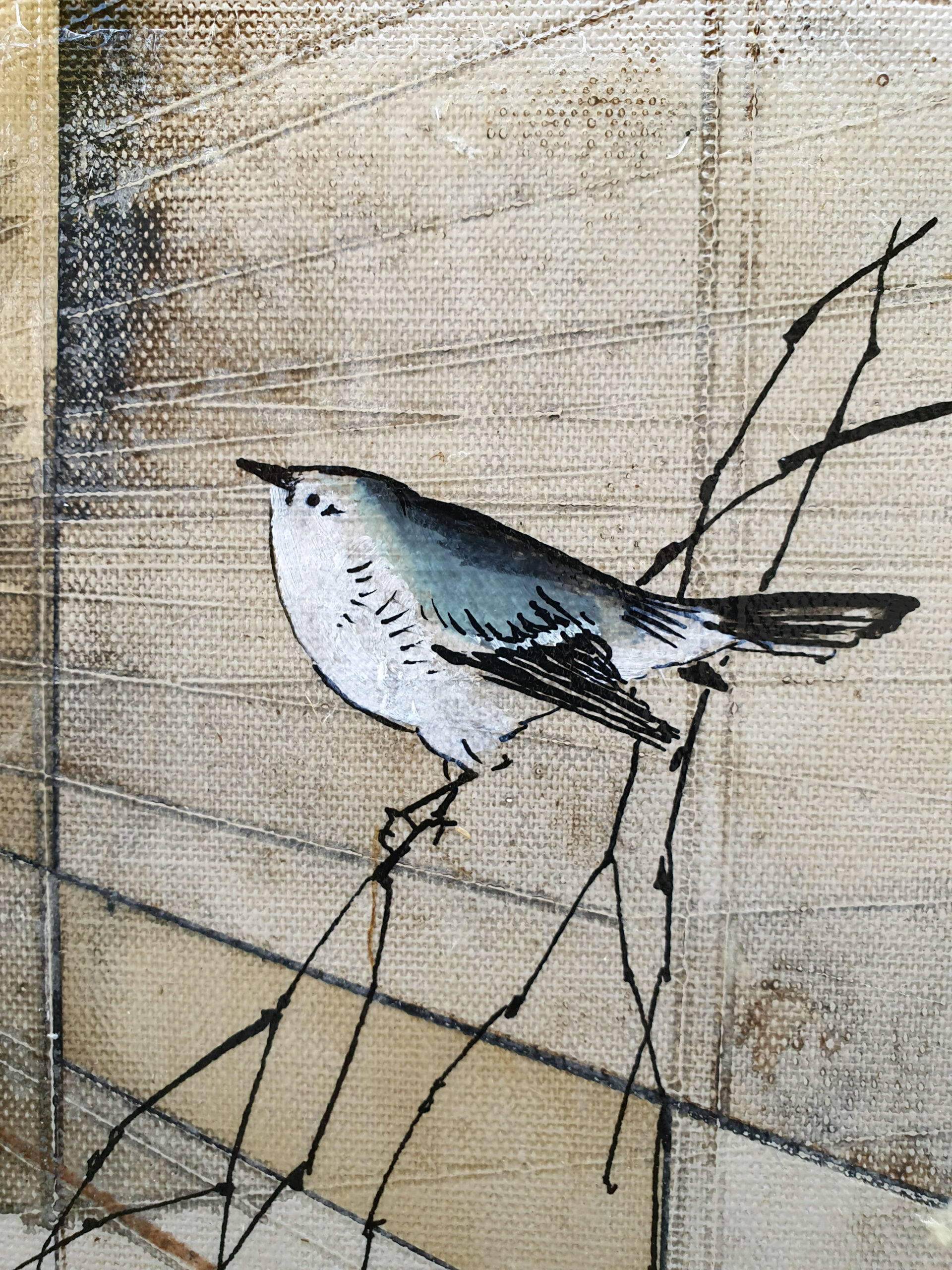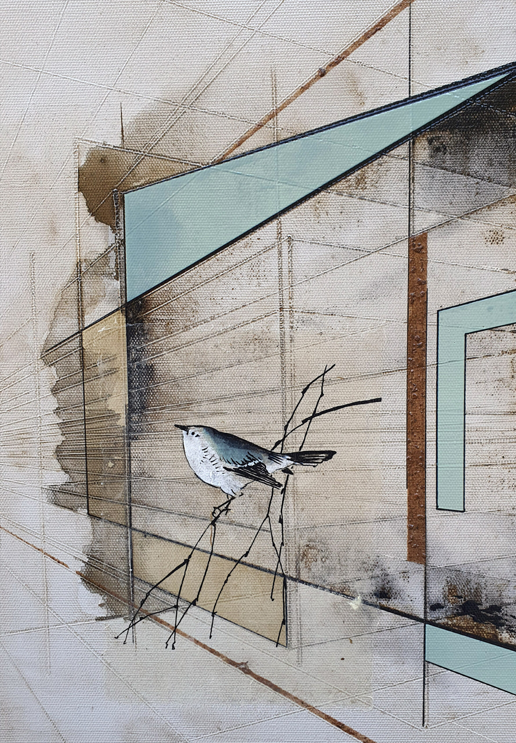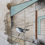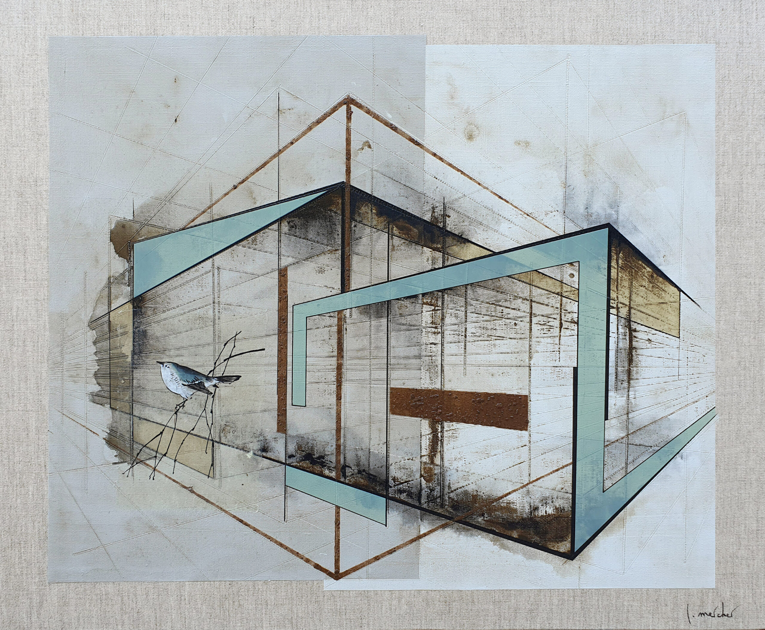 Dans RUST AND BIRD, je réunis encore l’oiseau et l’architecture dans un même espace suspendu. L’oiseau, peint sur papier coréen, conserve sa fragilité et sa légèreté propres. Il semble presque posé sur le silence, à la lisière des formes. Autour de lui, je construis des structures, des volumes, des lignes humaines. Les aplats et tracés marrons sont faits de pigments de rouille. Je fais rouiller d’anciens outils, j’en recueille la poudre, mémoire du travail et du temps. Mélangée au liant acrylique, la rouille devient matière picturale. Elle parle d’usure, de transformation, de ce qui persiste malgré l’abandon. L’architecture porte cette mémoire, lourde mais ouverte. Face à elle, l’oiseau demeure libre, fragile et vivant, comme une réponse au temps.
