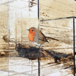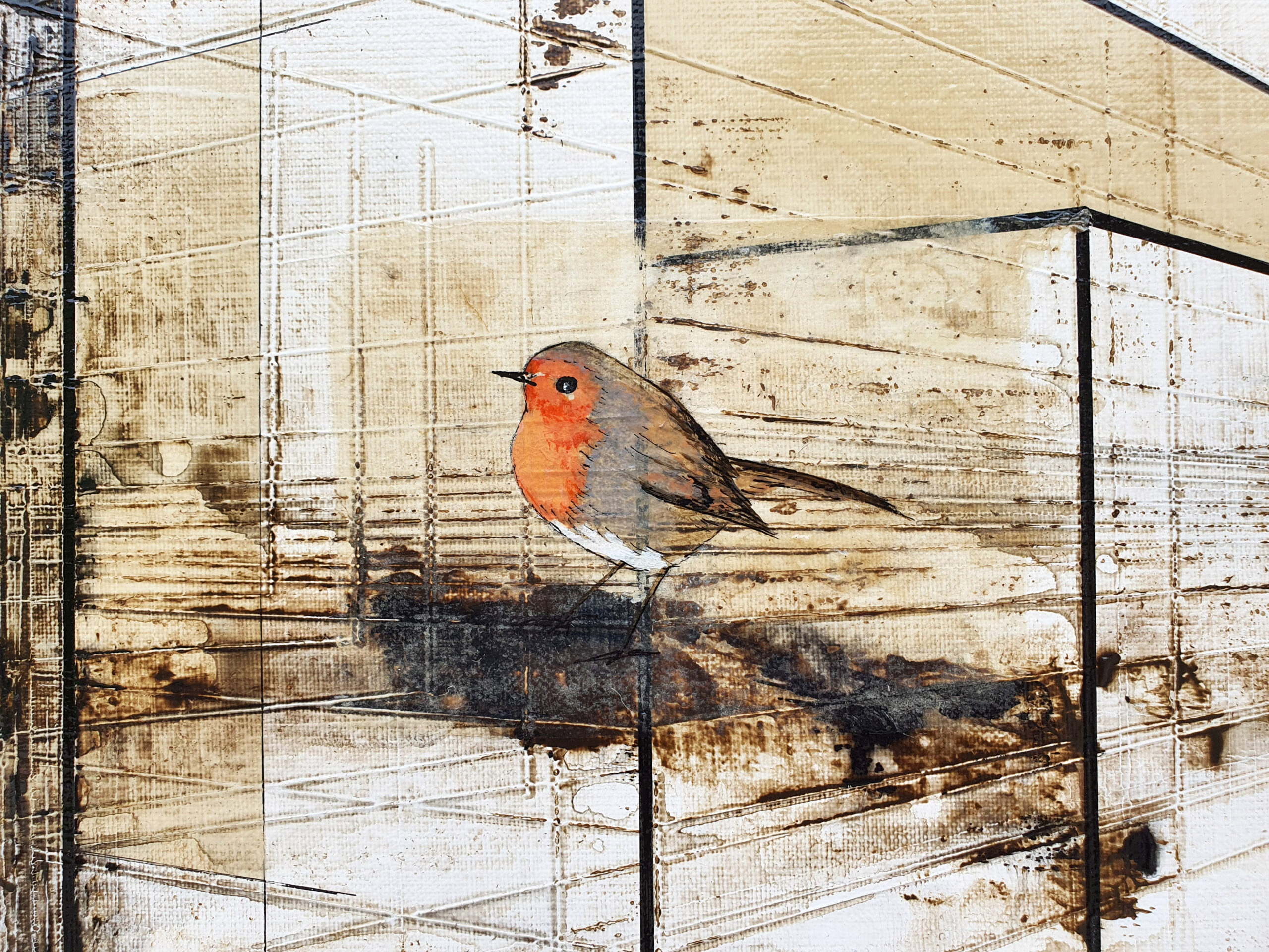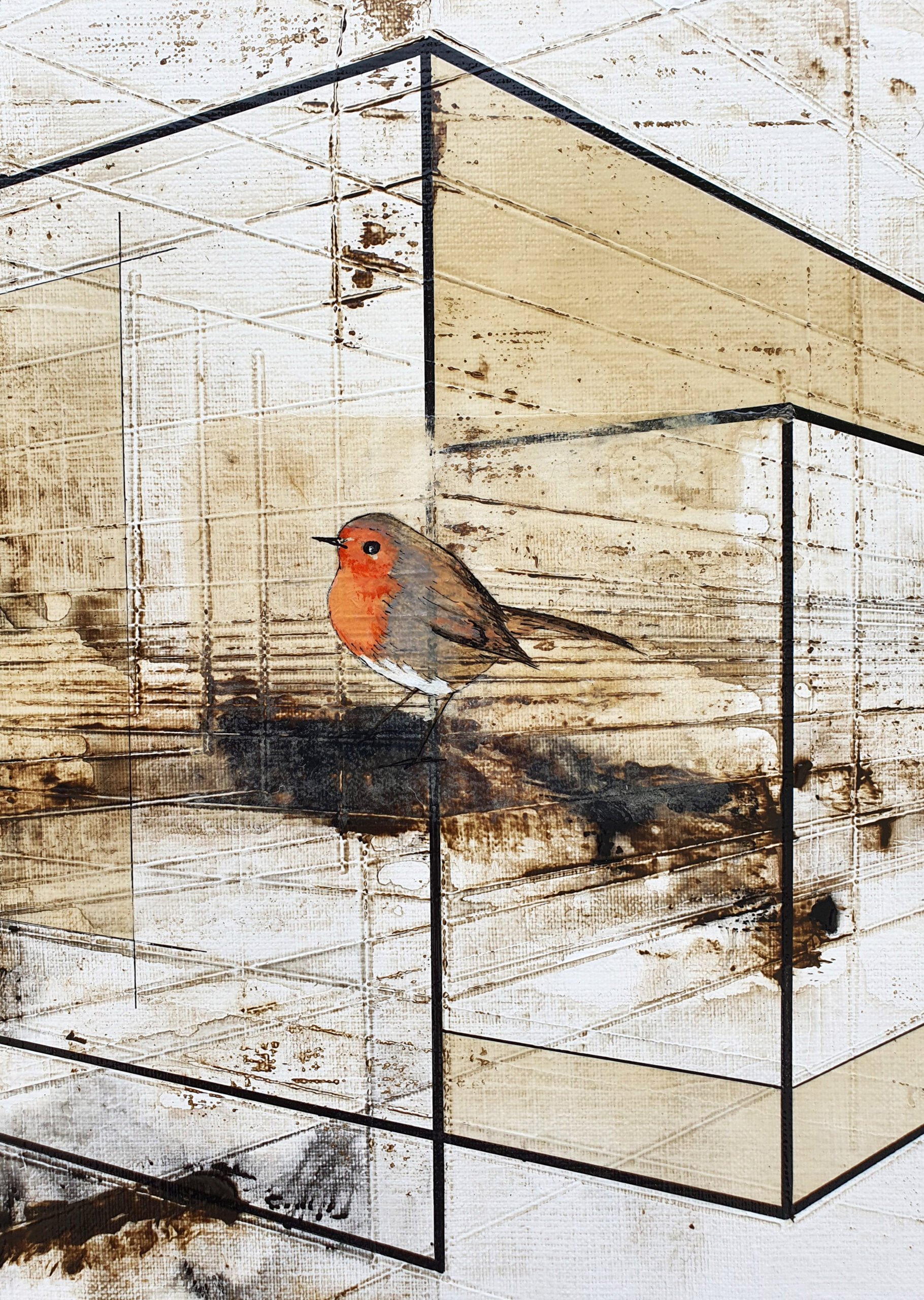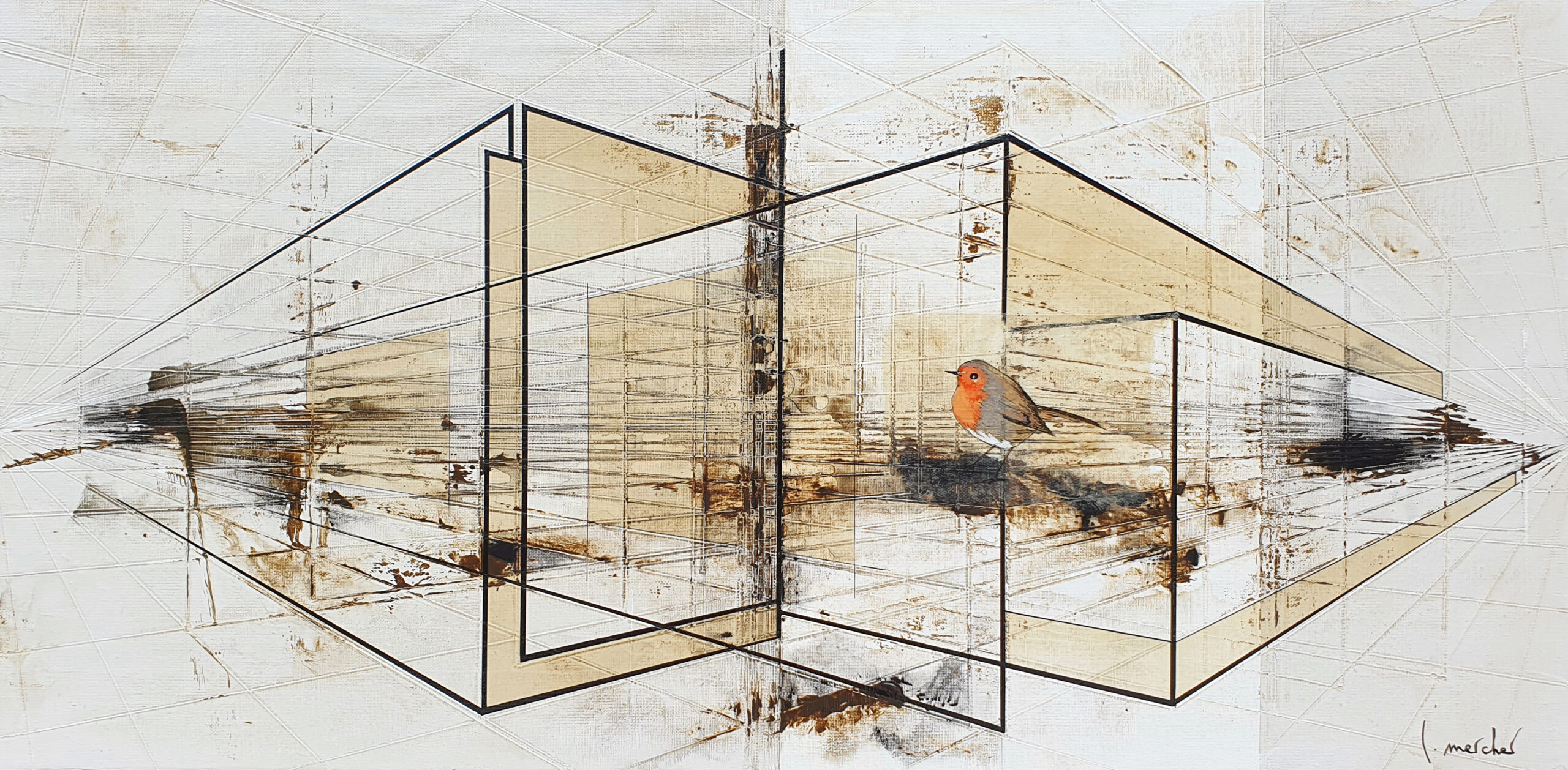 Dans « Freedom », j’ai voulu explorer le contraste saisissant entre la rigueur de l’esprit humain et la fragilité spontanée du vivant. Cette architecture de lignes de fuite et de formes translucides symbolise l’empreinte de l’homme, sa volonté de structurer et de compartimenter l’espace. Pourtant, au cœur de ce labyrinthe géométrique, j’ai posé un rouge-gorge (peint sur du papier coréen avant d’être marouflé sur la toile). Sa présence et sa touche de couleur vive brisent la froideur des perspectives, agissant comme un souffle de vie au milieu des structures rigides. Pour moi, ce petit oiseau représente une liberté qui ne s’encombre d’aucune frontière, se jouant des murs invisibles que nous bâtissons. Il se pose sur ces cages de verre sans y être enfermé, rappelant que la nature finit toujours par trouver son chemin à travers nos constructions.