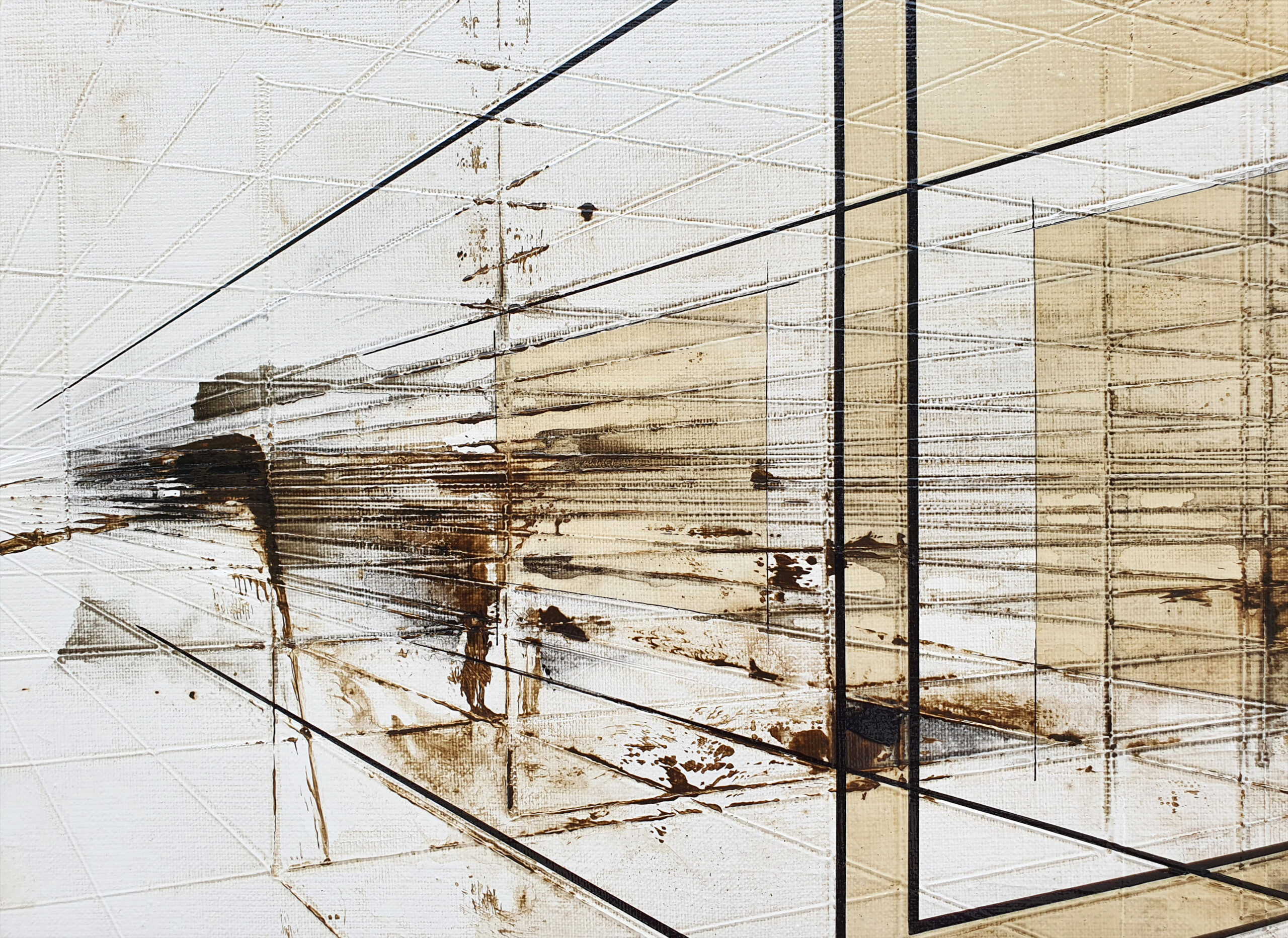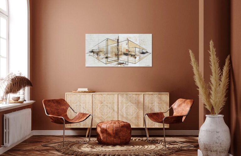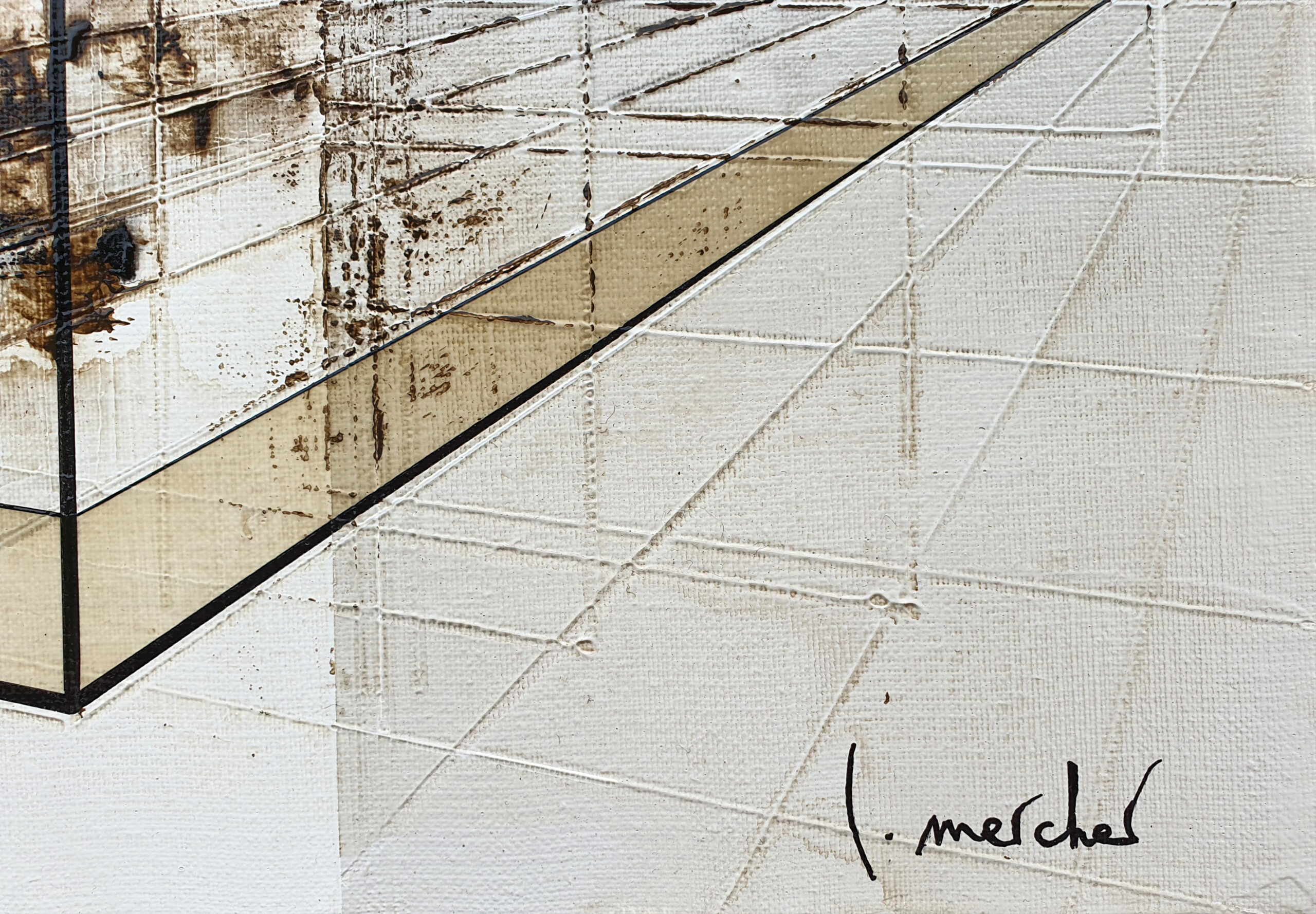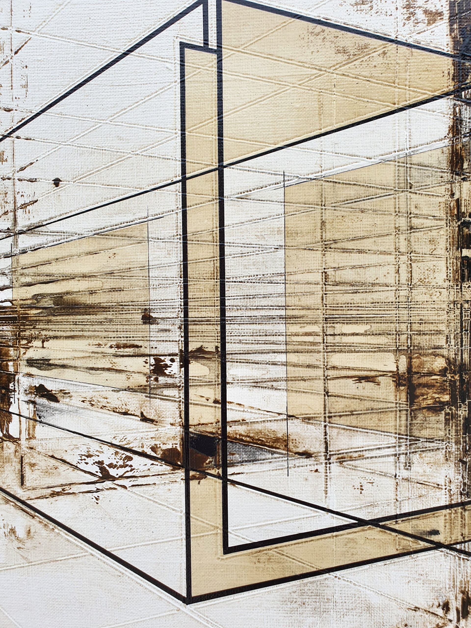 Dans « Freedom », j’ai voulu explorer le contraste saisissant entre la rigueur de l’esprit humain et la fragilité spontanée du vivant. Cette architecture de lignes de fuite et de formes translucides symbolise l’empreinte de l’homme, sa volonté de structurer et de compartimenter l’espace. Pourtant, au cœur de ce labyrinthe géométrique, j’ai posé un rouge-gorge (peint sur du papier coréen avant d’être marouflé sur la toile). Sa présence et sa touche de couleur vive brisent la froideur des perspectives, agissant comme un souffle de vie au milieu des structures rigides. Pour moi, ce petit oiseau représente une liberté qui ne s’encombre d’aucune frontière, se jouant des murs invisibles que nous bâtissons. Il se pose sur ces cages de verre sans y être enfermé, rappelant que la nature finit toujours par trouver son chemin à travers nos constructions.
