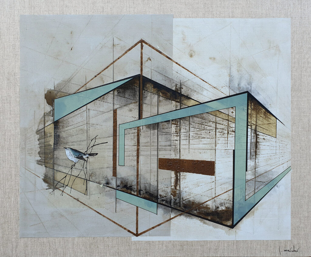 J’ai été marqué très tôt par l’architecture et cette influence est déterminante dans cette série. Toutes ces structures s’inscrivent dans un espace qui semble infini. J’imagine des points de fuite dans toutes sortes de projets. J’élabore ces toiles avec un imaginaire en mouvement et en perpétuelle construction.